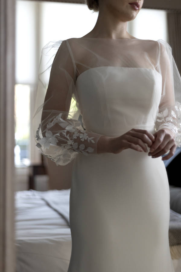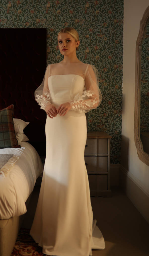 The Bella wedding gown is perfect for a cosy candlelit venue, a stately home ceremony, or any winter setting where you want to feel timeless, feminine, and effortlessly graceful. The combination of structured simplicity and soft, embroidered sleeves gives it a unique, elegant, and contemporary bridal aesthetic.