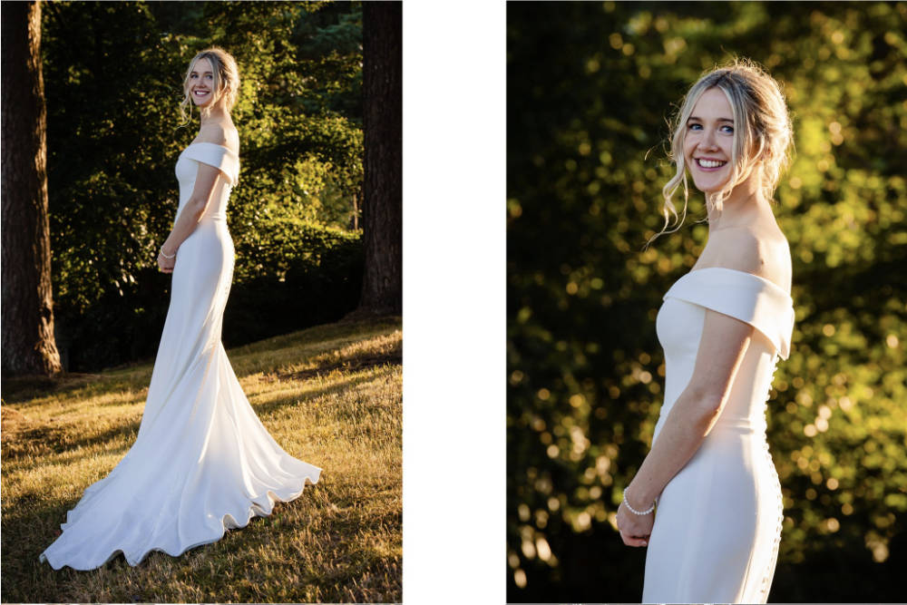 Ailsa wore the Rebecca gown made in a luxurious double crepe fabric- chic, elegant and understated.The off shoulder bodice with the sweetheart neckline is exquisite, exposing your collar bones and elongating your neck. The off shoulder straps are a statement of their own, the wrap around effect of the material provides structure and will prevent the straps from feeling loose. The bodice is made with a bespoke boning which will ensure you feel secure and keep your posture upright throughout the day- the boning is designed to feel comfortable- letting you dance, eat and enjoy!